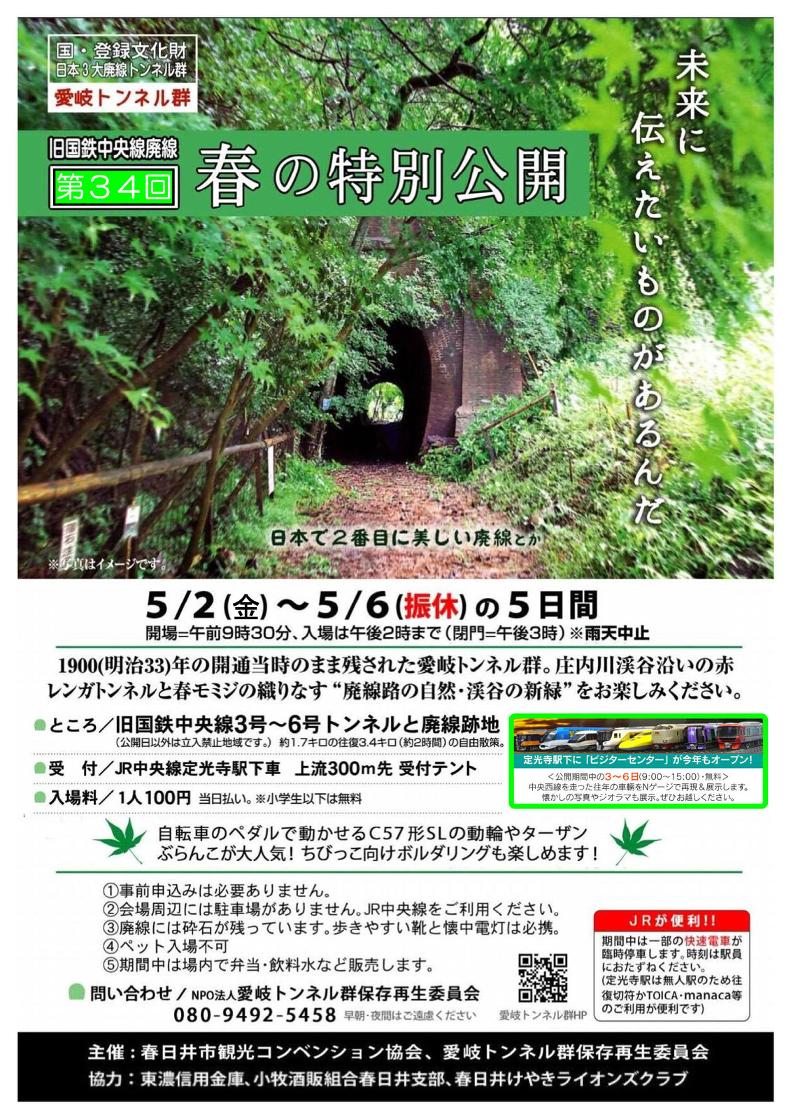 2025年04月28日 『愛岐トンネル 春の特別公開』は5/2(金)~5/6(火・振休)の5日間で開催 『愛岐トンネル 春の特別公開』が開催されます。 人気の愛岐トンネル群の公開。春の特別公開は5/2(金)~5/6(火・振休)の5日間。 秋の公開が有名で特に人気の恒例イベントですが、この新緑の時期に見るのもまた違った良さがありますね。 興味のある方はぜひ! ■愛岐トンネル 春の特別公開 開催期間:2025年5/2(金)~5/6(火・振休) ※雨天中止 場所:旧国鉄中央線3号~6号トンネルと廃線跡地 < 前の記事次の記事 >