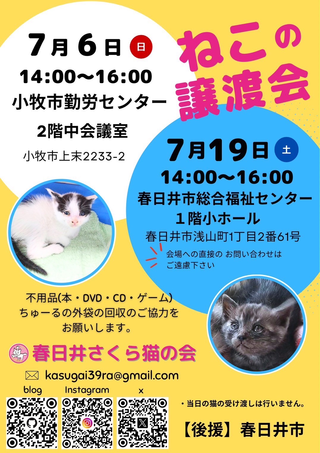 「春日井さくら猫の会」が主催する『猫の譲渡会』が7/19(土)に開催されます。