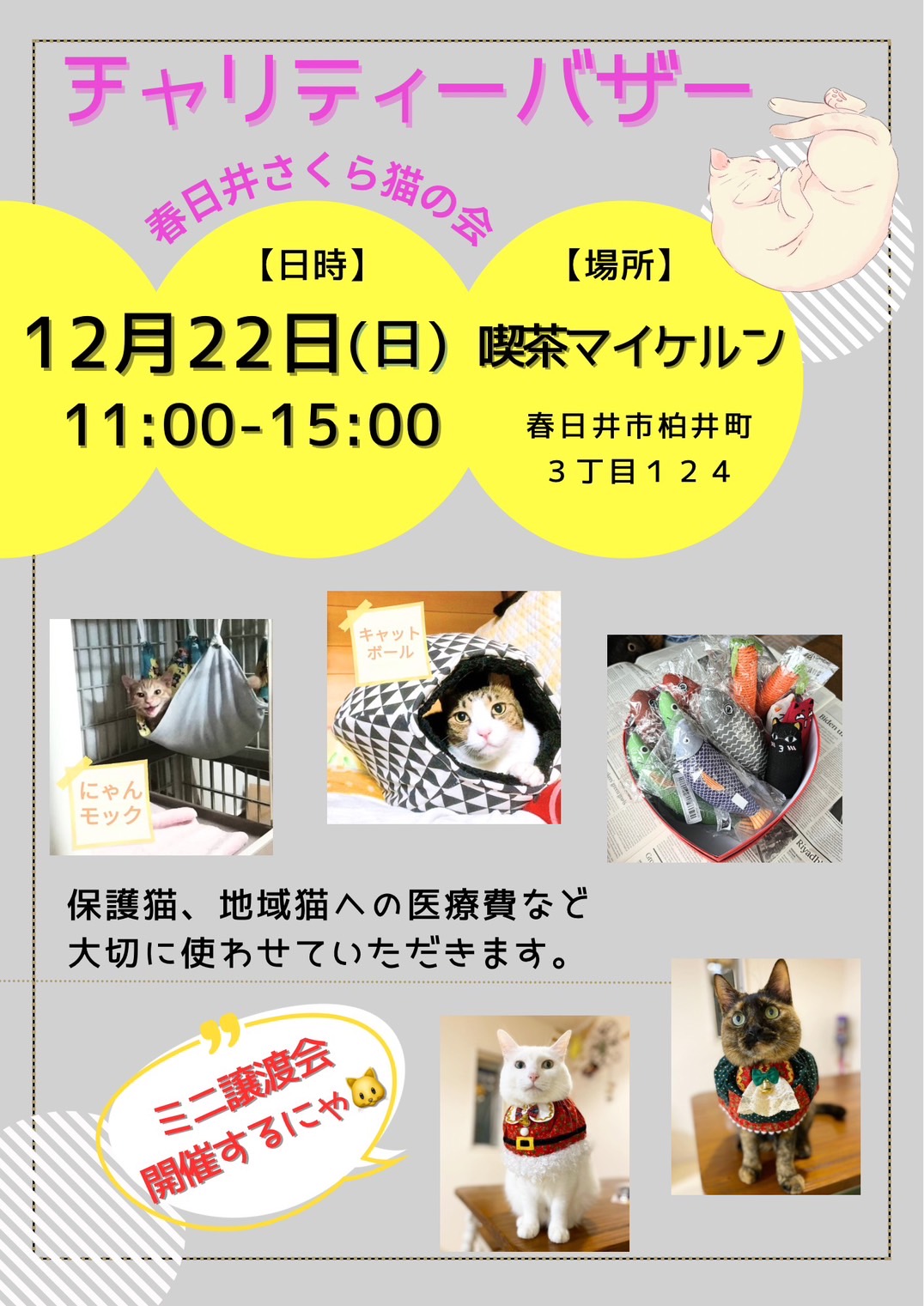 春日井さくら猫の会による年内最後?の猫イベントだと思うので、興味のある方はぜひ。