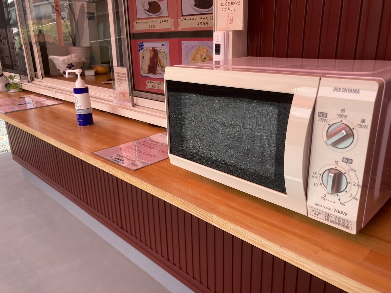 店の前にレンジが備え付けてあるので、すぐ食べたい時はこちらを使用します。