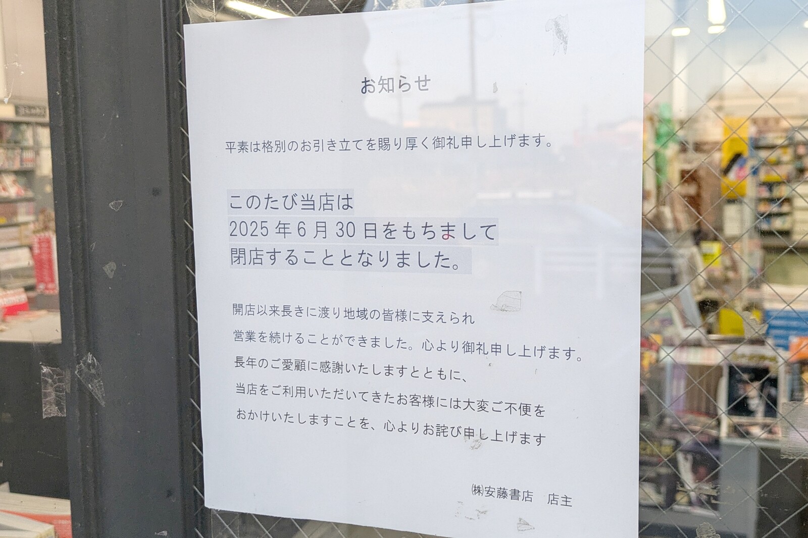 春日井市東野町の「安藤書店」が閉店するようです。落合公園のすぐ近くにある書店。