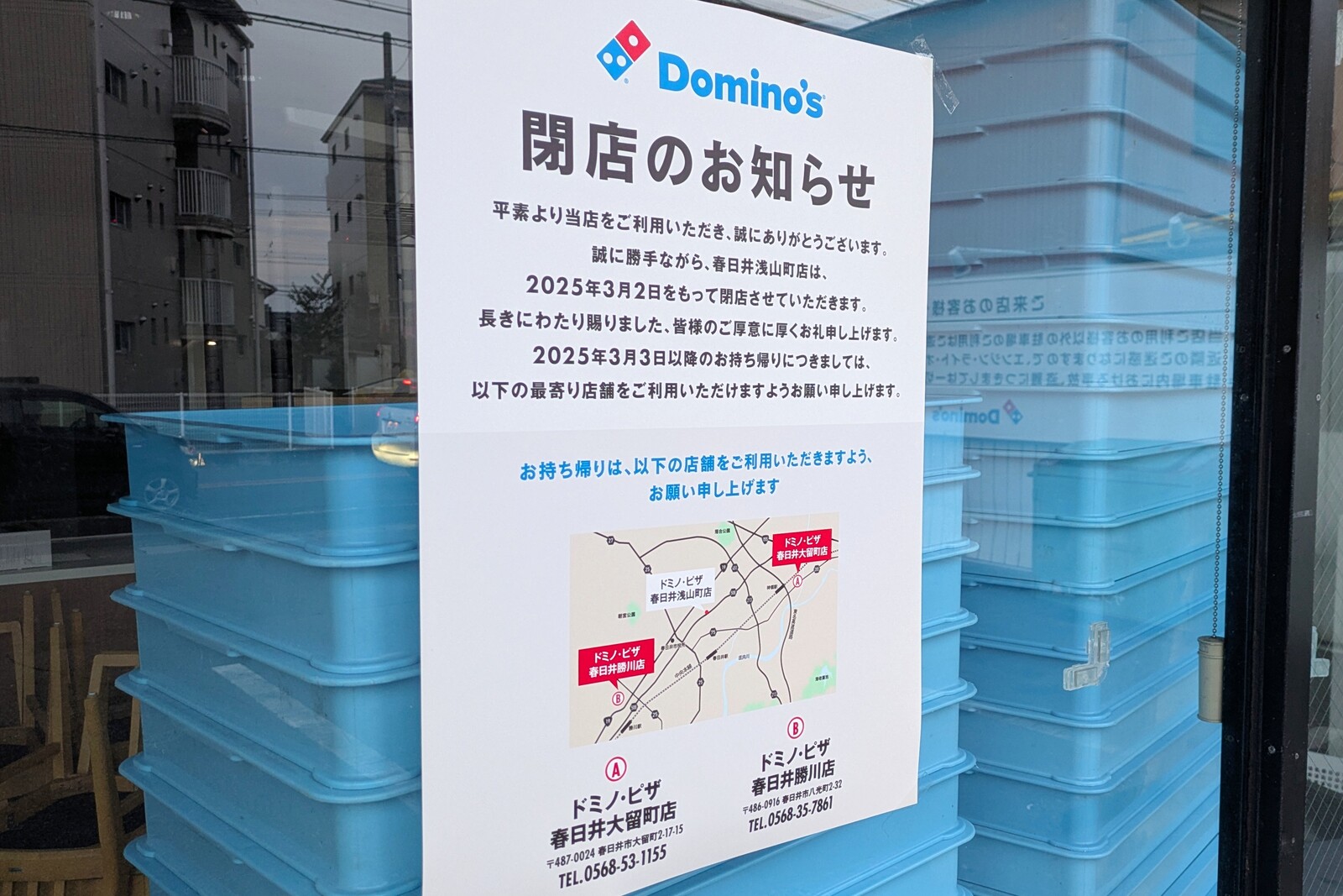 2025年03月10日 「ドミノ・ピザ 春日井浅山町店」が閉店してる(春日井市浅山町) 春日井市浅山町の「ドミノ・ピザ 春日井浅山町店」が閉店していました。 旧国道19号沿いで営業していた店舗。コインランドリーが隣接しています。電気がついておらず、営業している様子はなし。ドアに貼り紙のようなものが見えます。3月2日をもって閉店したとのこと。近隣店舗は春日井大留町店と春日井勝川店になりますが、どちらもそこそこ距離があります。 ■ドミノ・ピザ 春日井浅山町店(※閉店済み) 住所:愛知県春日井市浅山町1丁目1298-1備考:2025年3月2日をもって閉店 < 前の記事次の記事 >