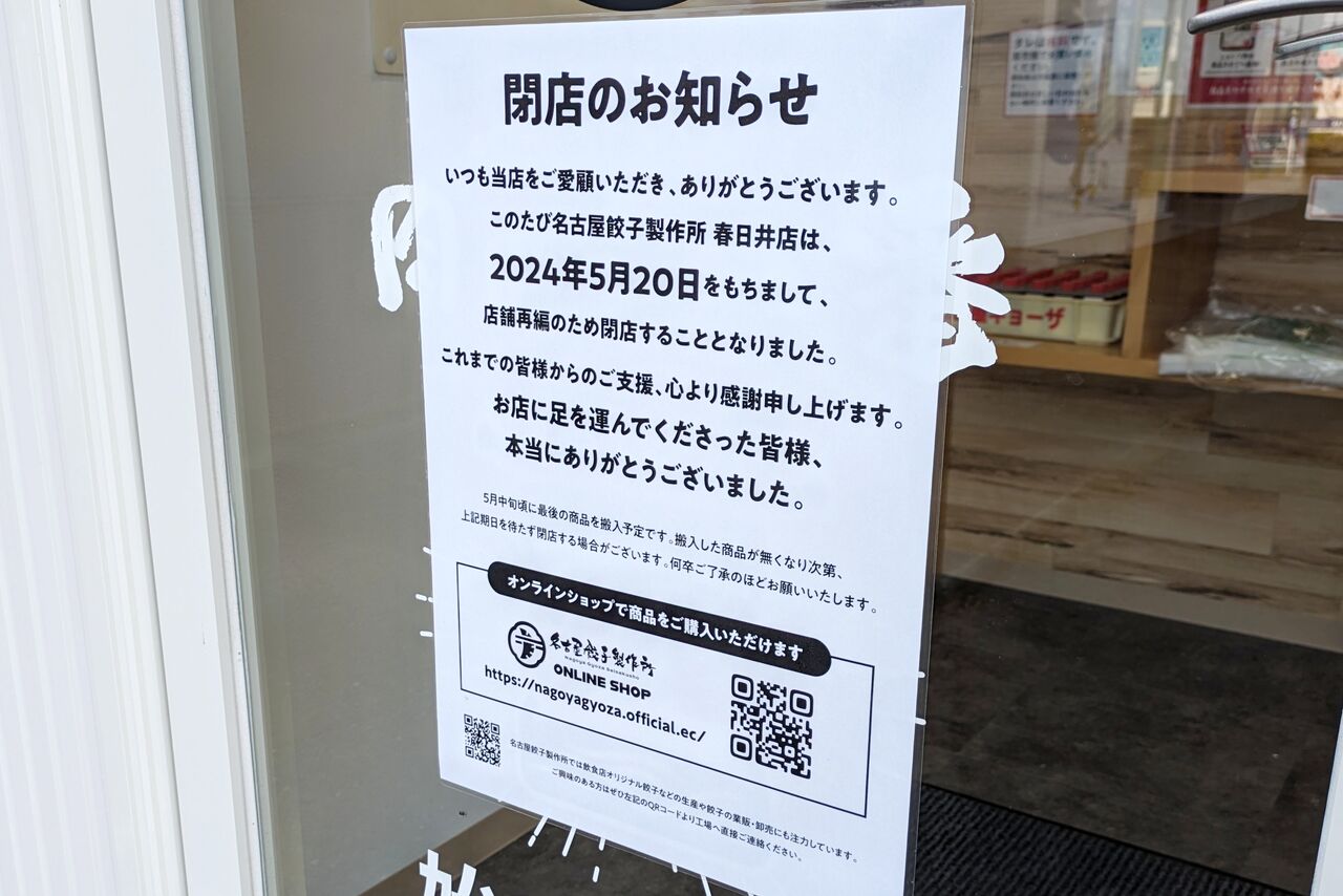 春日井市宮町の「名古屋餃子製作所 春日井店」が閉店しています。
