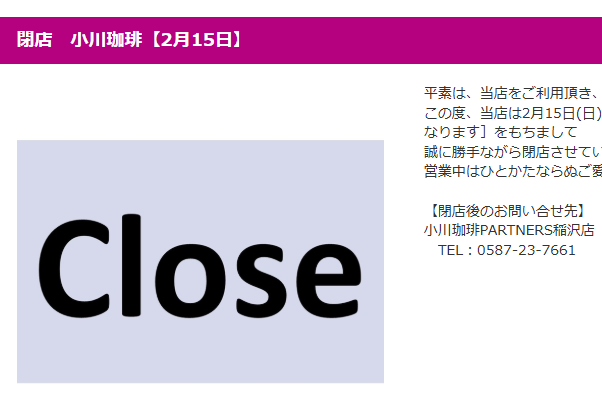 閉店後のお問い合せ先は小川珈琲PARTNERS稲沢店となります。