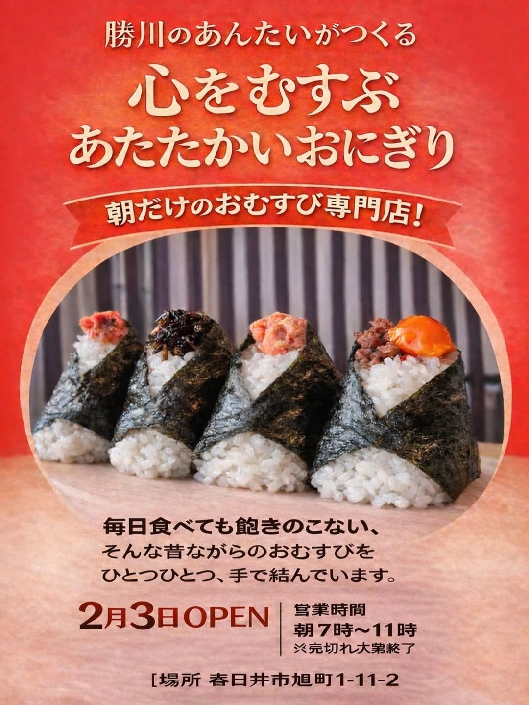 春日井市旭町に“朝だけ”のおむすび専門店がオープンしています。
