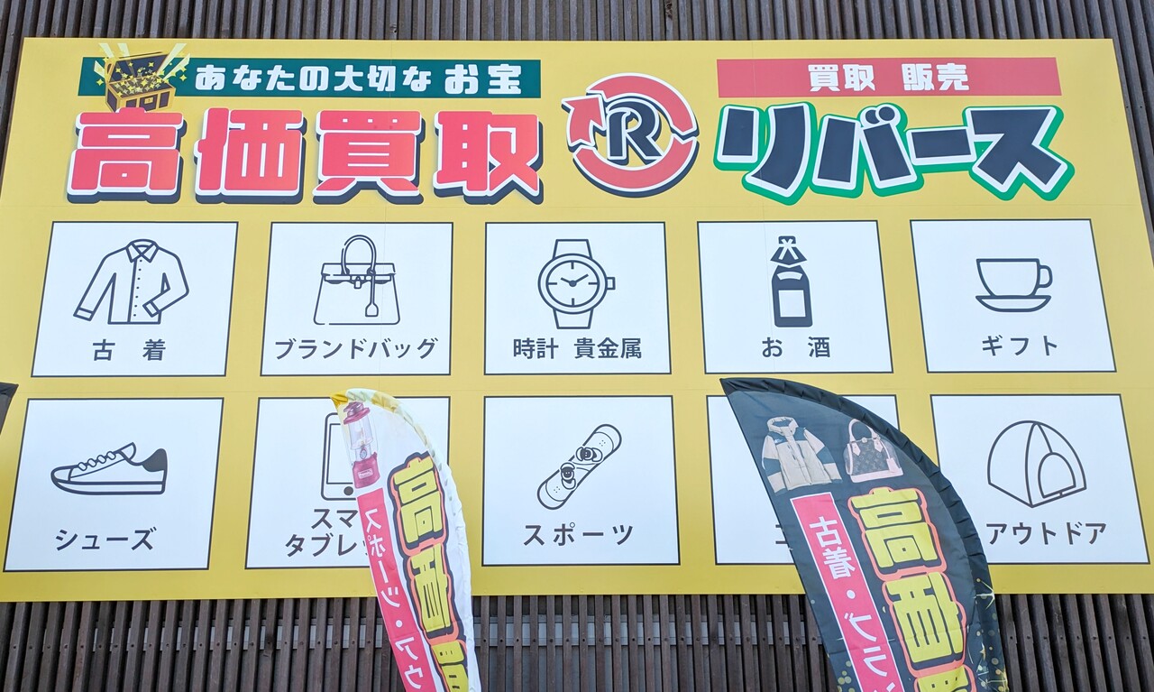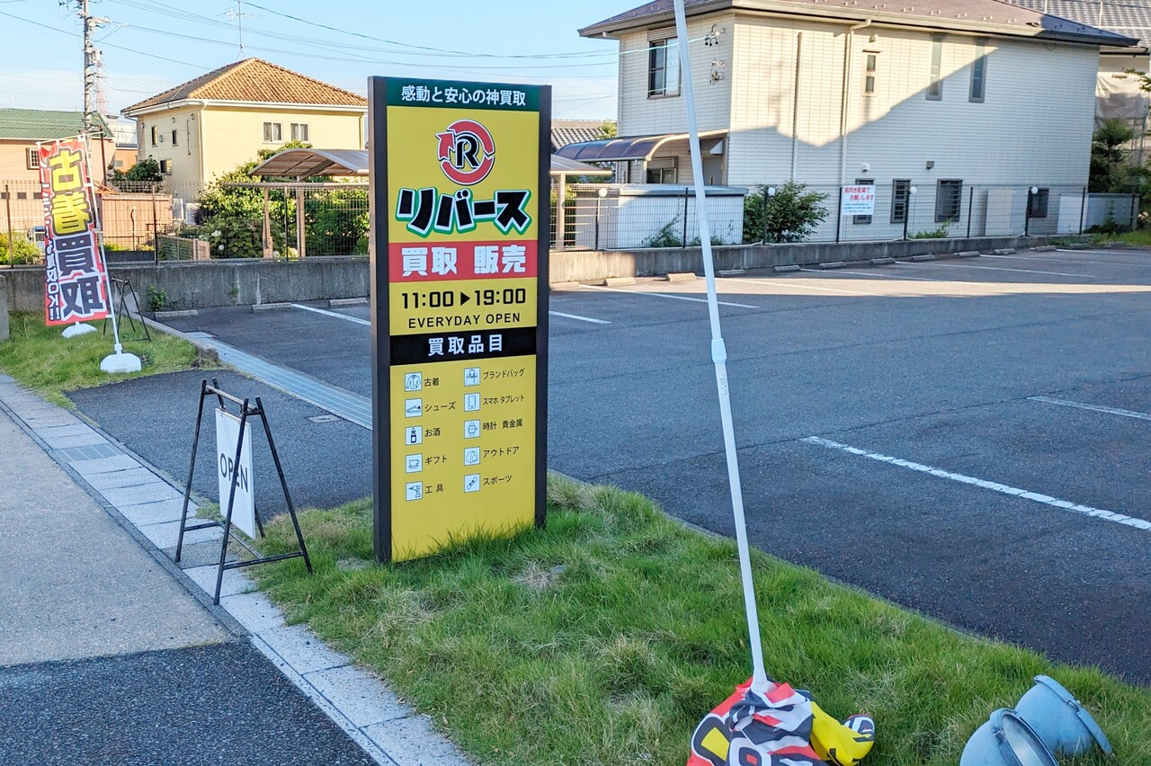 買取 販売と書かれた看板。リバース春日井店というお店。