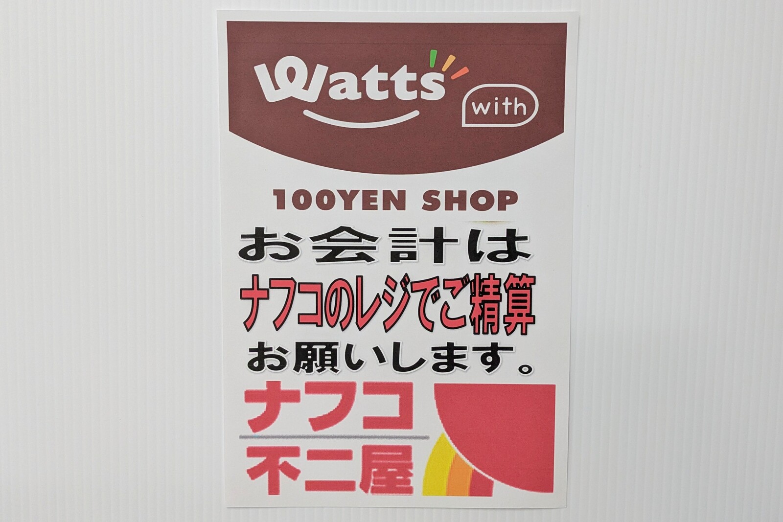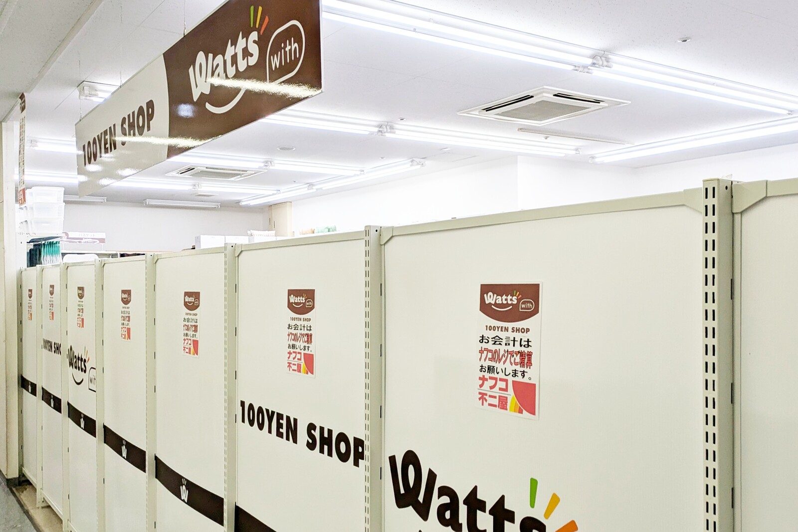 こちら。ナフコ坂下店内の一角に100円ショップの「ワッツウィズ」が誕生。11月22日にオープンしたとのこと。
