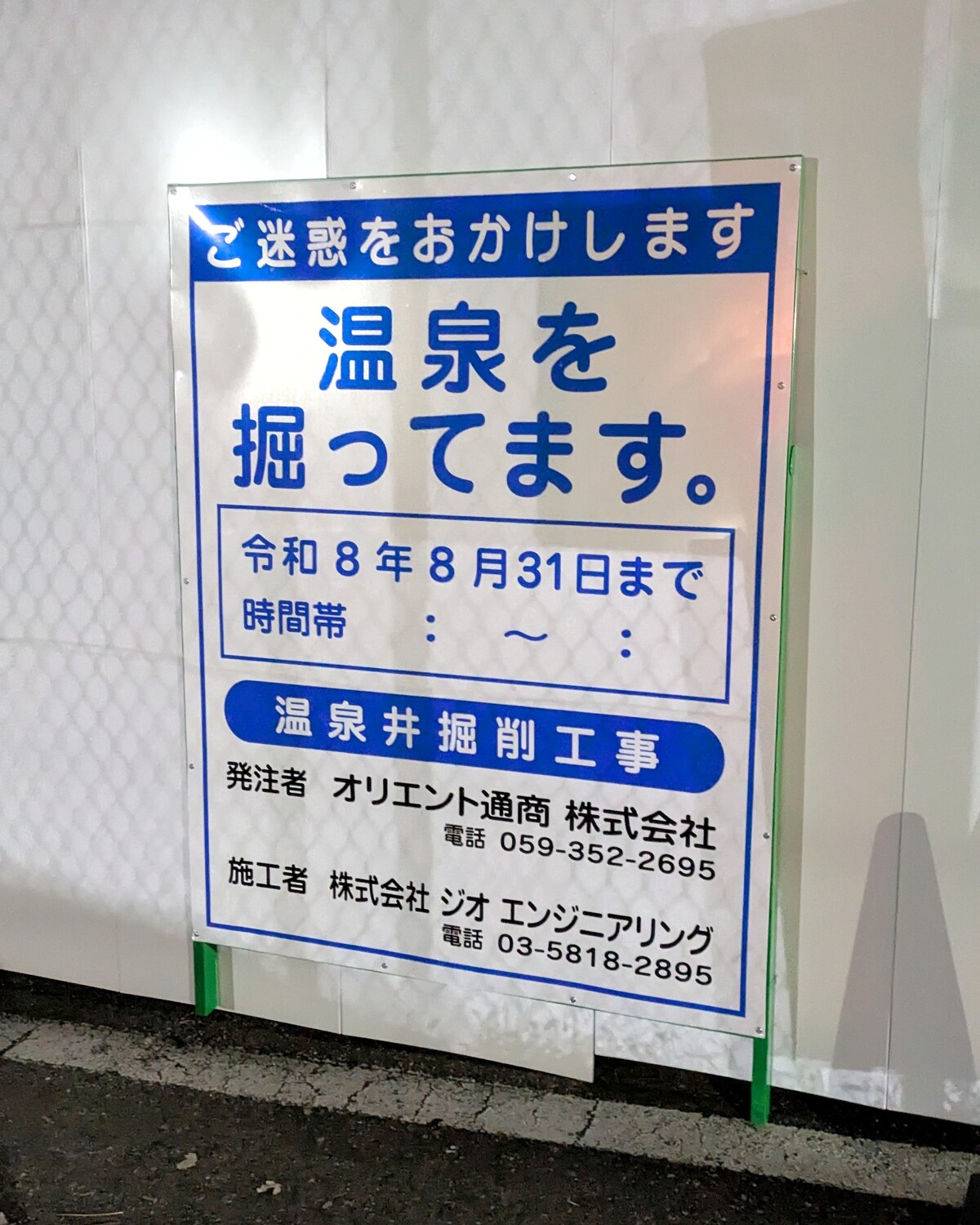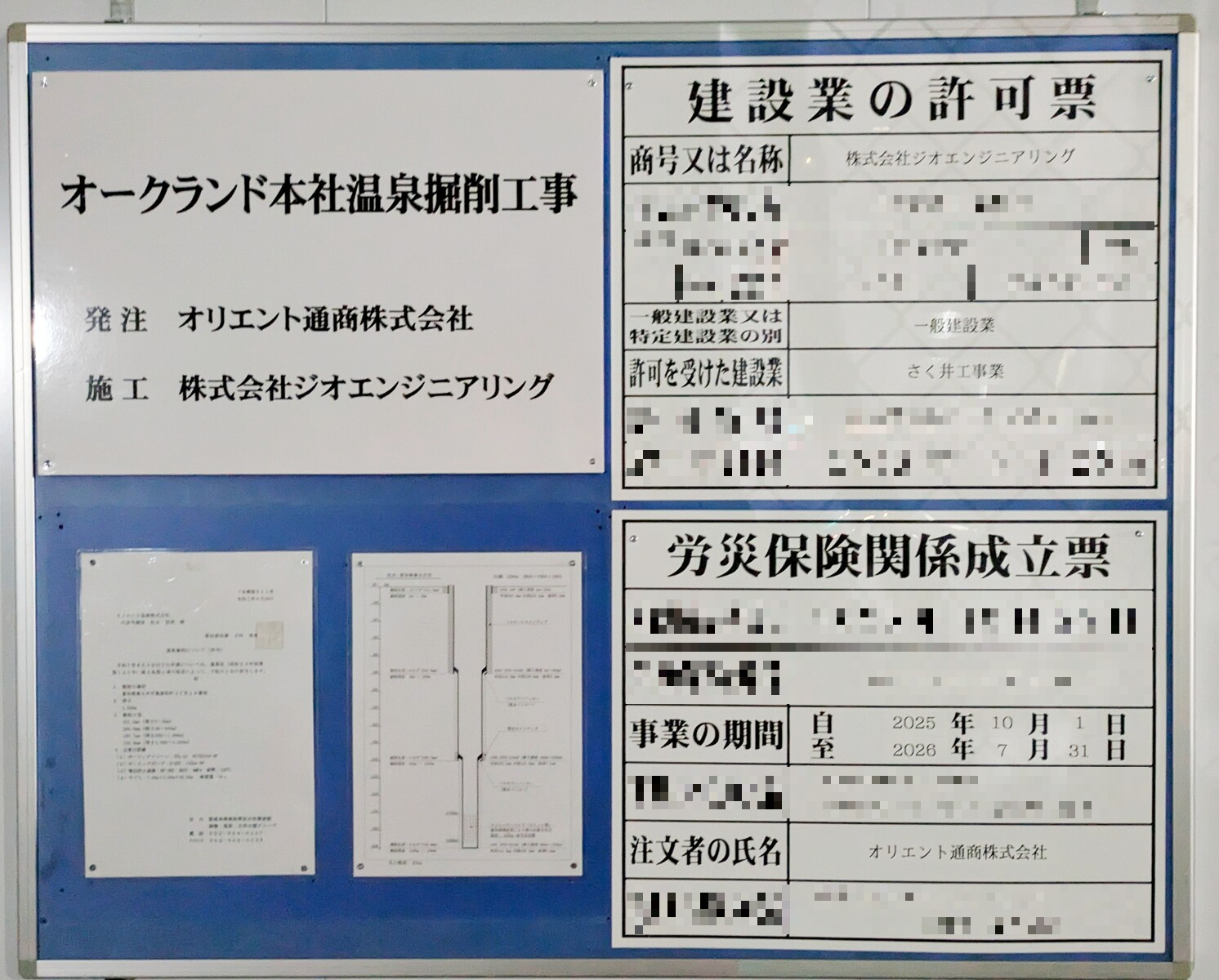 工事標識も。工事名は、オークランド本社温泉掘削工事。