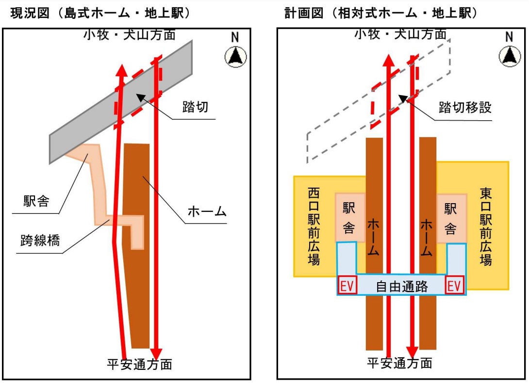 島式ホームから相対式ホームになり、自由通路も設置。西口駅舎の位置も少し変わります(道路から離れる)。