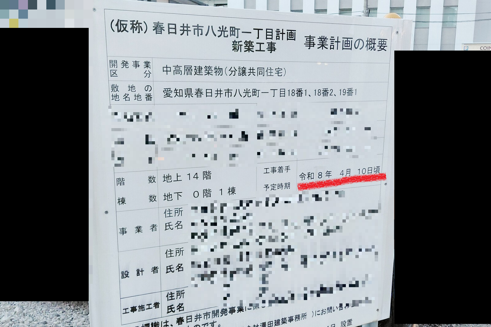 以前は無かった看板が。(仮称)春日井市八光町一丁目計画新築工事と書かれた概要。